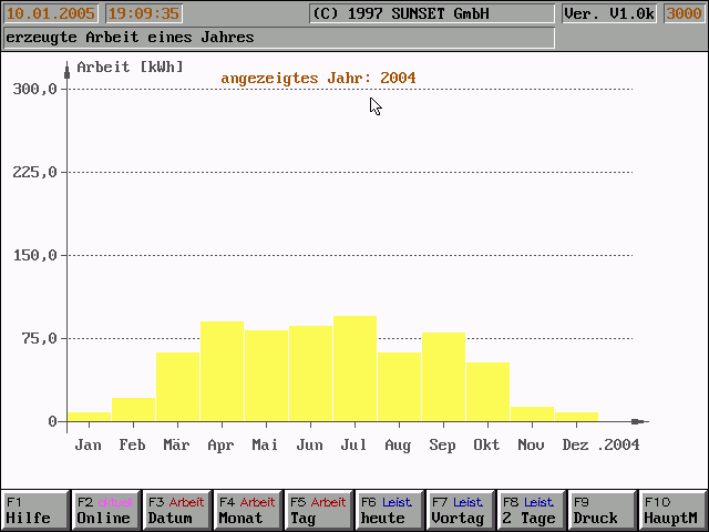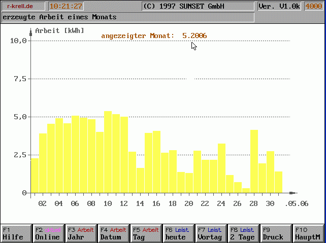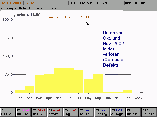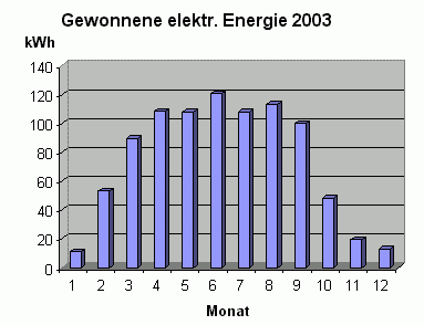 Übrigens: Am 13.4.00 hatte unsere Anlage die die tausendste kWh erreicht, Ende Dezember 2000 stand der Zähler bei etwas über 1620 kWh. Ein Jahr später, Anfang 2002, waren dann 2430 kWh erreicht. Zu Beginn des Jahres 2003 stand der Zähler auf 3239 kWh, im Januar 2004 wurden 4215 kWh angezeigt (4976 kWh am 15. Oktober 2004) und im April 2006 waren es insgesamt 6000 kWh - in den Jahren 2000 bis 2006 haben wir also jährlich etwa 810 kWh gewonnen und im außergewöhnlich sonnigen 2003 sogar fast 1000 kWh elektrische Energie. Dadurch wurden inzwischen über 4800 kg des Treibhausgases Kohlendioxid eingespart (das bei Bezug des Stroms von einem Verbrennungskraftwerk entstanden wäre).