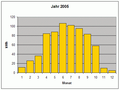 Sieht man nur die Grafik mit dem monatlichen Anstieg der gewonnenen Energie in den letzten Jahren, so geht der Blick für die jahreszeitlichen Schwankungen eventuell verloren. Deswegen gibt's hier alle Monate der Jahre 2000 bis 2006 im Überblick.