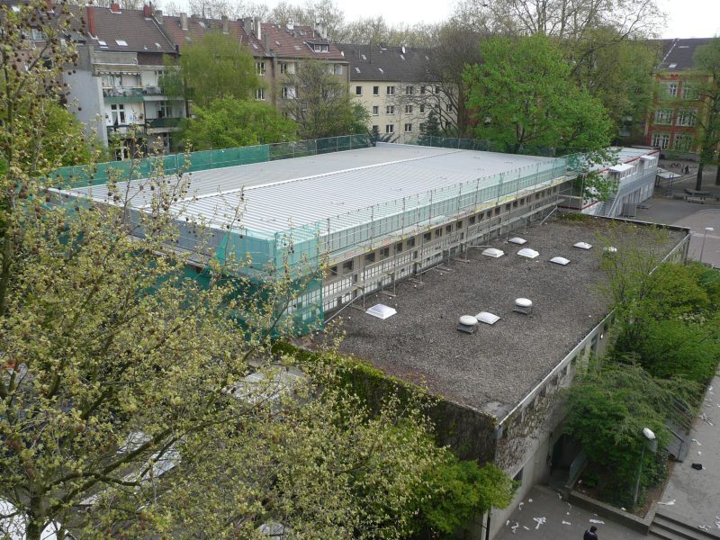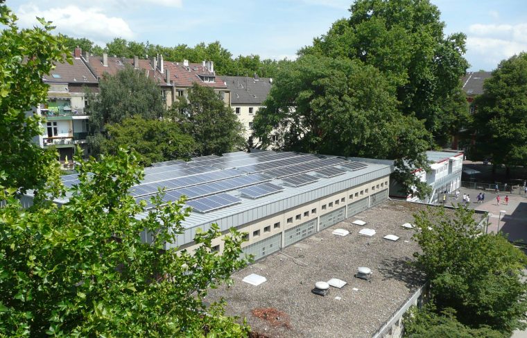 Mitte Januar 2011 wurden die alten neun Fotovoltaik-Elemente (die weiter unten noch gezeigt werden) abgebaut, um die Sanierung des Turnhallendachs zu ermöglichen. Danach kam die rund 35-fache Anzahl von Solarplatten im Rahmen einer Bürger-Solaranlage ("Düssel-Solar 7") aufs frische Dach, sodass seit 21. Juli 2011 viel mehr elektrische Energie aus dem Sonnenlicht gewonnen wird.