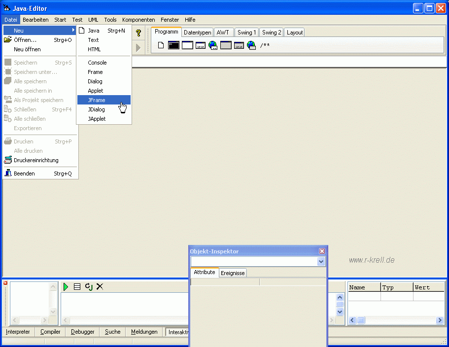 Jedenfalls soll die Oberfläche unseres Sortierprogramms mit der 'schöneren' Swing-Bibliothek erstellt werden. Benutzt wird der intuitive GUI-Builder des empfehlenswerten Java-Editors, einem kompakten Programm, das sich ideal für den Unterricht eignet (vgl. meine Seite a)). Im Allgemeinen reicht es, wenn die Schülerinnen und Schüler damit ansprechende und passende Oberflächen erzeugen und diese 'mit Leben' füllen können -- nur wenige wollen den automatisch erzeugten Java-Quelltext wirklich genau verstehen oder könnten ihn gar von Hand notieren (was sicher auch nicht nötig ist). Trotzdem hilft ein Blick in den automatisch erzeugten Text, um in eigenen Projekten eventuell weitere, nicht vom GUI-Builder bereitgestellte Grafik-Elemente oder Listener in analoger Weise von Hand zu ergänzen.