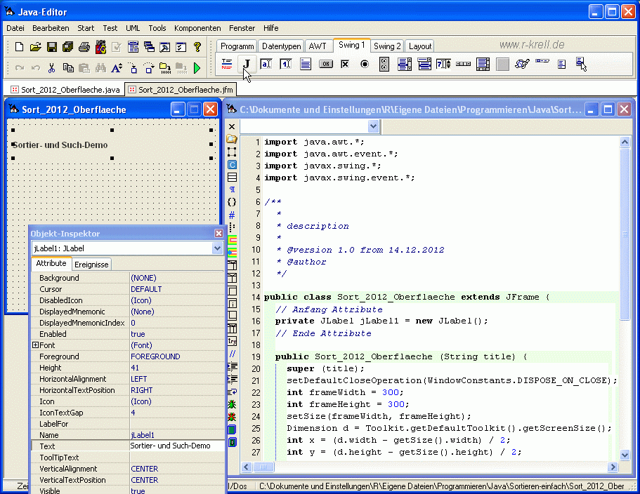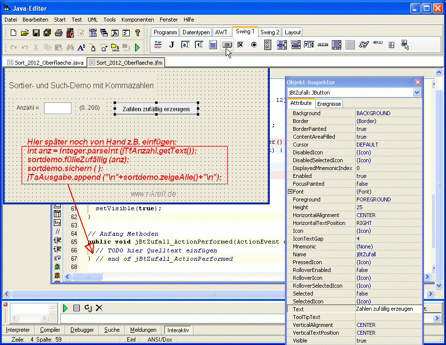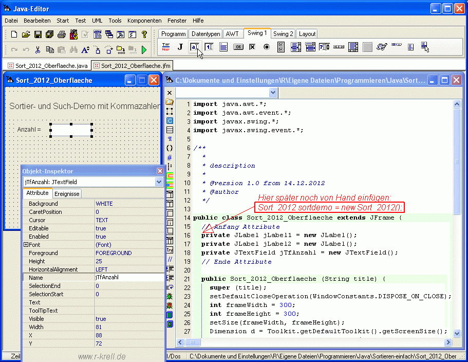 Erstellt wird die Oberfläche Sort_2012_Oberflaeche durch Ziehen und Ablegen, wobei ich Wert darauf lege, dass Textfelder, Schaltflächen u.ä. Elemente, die später noch gebraucht werden, im Objektinspektor direkt mit sprechenden Namen versehen werden:Automatisch erzeugt der Javaeditor (hier in der Version 11.27 vom 5.12.2012) den zugehörigen Java-Quelltext, in den schließlich nur noch ein Objekt sortdemo der (ganz selbst zu schreibenden) Klasse Sort_2012 eingebunden werden muss, das die eigentliche Arbeit macht (also die Reihung, deren zufälliges Erzeugen und die Sortierverfahren enthält -- s.u.). Diese weitere Klasse sollte getrennt und unabhängig von der Oberfläche geschrieben werden und auch ohne bzw. mit ganz anderen Oberflächen funktionieren! Und an den automatisch mit //TO DO bezeichneten Stellen der Rahmenmethoden zu den Schaltflächen werden die gewünschten Aktionen eingebaut: Befehle im Zusammenhang mit der Oberfläche unmittelbar; zufälliges Erzeugen und Sortieren u.ä. durch Aufruf geeigneter Methoden aus dem Extraobjekt sortdemo (siehe rote Ergänzungen in den vorstehenden Bildern. Die Bilder können übrigens durch Anklicken größer in einem eigenen Fenster geöffnet oder durch Rechtsklick und "Bild speichern unter.." herunter geladen werden)