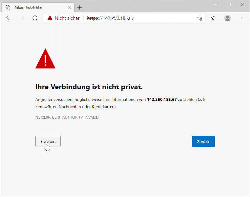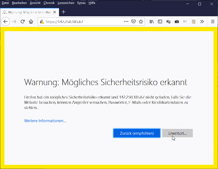 Wenn Sie auf den Zahlenlink 142.250.185.67 geklickt haben, wird Ihr Browser hoffentlich nicht sofort die Google-Seite angezeigt haben. Vor einigen Jahren ging das noch ohne Weiteres. Inzwischen haben auch Kriminelle gemerkt, dass Besucher auf nachgemachten Bank-Seiten persönliche Daten nicht gerne preisgeben, wenn als Adresse z.B. "phishing-und-abzocke.xyz" gelesen werden kann. Deswegen haben Bösewichte eine zeitlang lieber unauffällige Zahlenadressen verwendet. Die Browserhersteller versuchen inzwischen, ihre Kunden davor schützen. Im März 2021 musste ich z.B. nach Anklicken der Zahlenadresse zwei Warnungen in den Wind schlagen, bevor die gewünschte Seite tatsächlich geladen wurde. Die nachfolgenden Bilder können jeweils durch Anklicken vergrößert im neuen, eigenen Tab angezeigt werden: