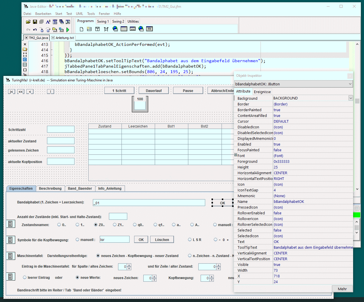 Ich werde daher die Oberfläche der Turing-Simulation zunächst also (wie alle meine letzten Beispiele) doch wieder mit Swing erstellen, d.h. unter Benutzung der mit Java mitgelieferten und von allen Java-Versionen weiterhin unterstützten Bibliothek.