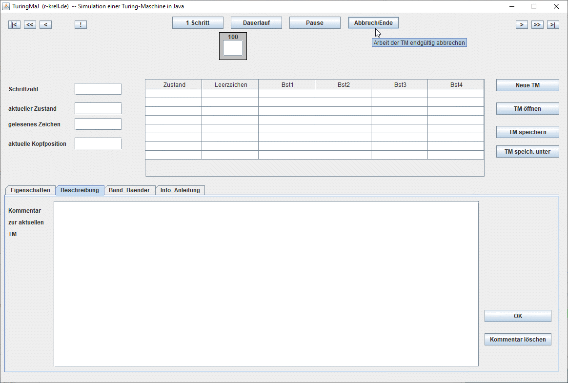 Wie man sieht, wurden gegenüber der Handskizze aus Kapitel 1 Abschnitt b2) oben auf dieser Seite schon einige Korrekturen vorgenommen. Insbesondere sind die Schaltflächen "Neue TM", "TM öffnen", "TM speichern (unter)" jetzt immer sichtbar, sollen aber nur bei Pause oder Abbruch/Ende benutzbar und während des Ablaufs der Turingmaschine deaktiviert sein. Weiterhin bin ich noch im Zweifel, wie man am besten (in der 1. Registrierkarte Eigenschaften) die Eingaben in die Maschinentafel vornimmt. Die im Moment vorgesehene Eingabemöglichkeit per 'Spinner' (wo man jeweils Zeichen, Zustand und Kopfbewegung aus dem vorher festgelegten Vorrat per Mausklick auf die Auf-/Ab-Pfeiltasten auswählt) verhindert zwar Fehleingaben, ist aber beim Abschreiben einer längeren Maschinentafel aus einem Buch oder einer gedruckten Veröffentlichung langwieriger als das Eintippen jeweils eines kompletten Maschinentafeleintrags per Tastatur in ein Textfeld. Für das Band habe ich schon eine solche Text- bzw. Stringeingabe der gesamten Bandinschrift vorgesehen.