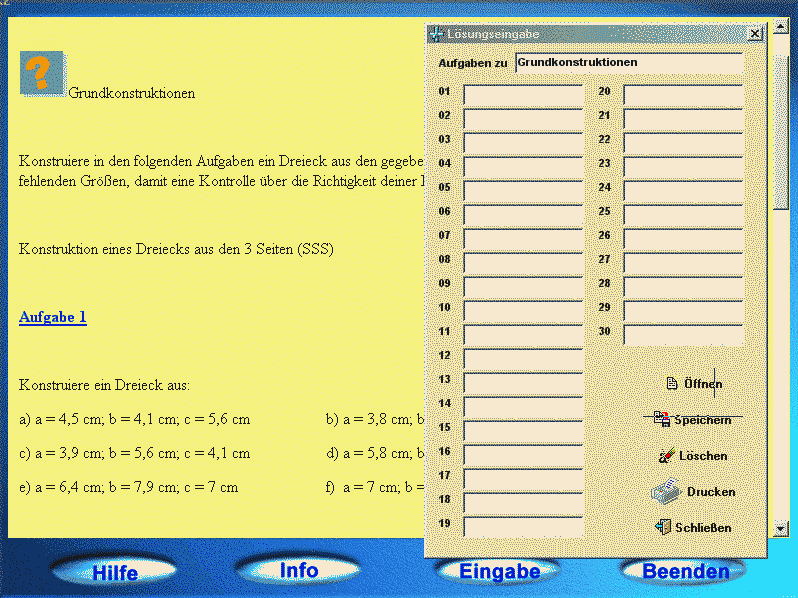 - durch Druck auf das „?"-Symbol - einen kurzen Lehrtext in schlechtem Layout abrufen, aus dem man nicht mehr zurück