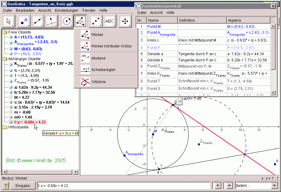 oder Menübefehl für Tangenten, aber die Konstruktion mit dem Thaleskreis (Kreis durch P um den Mittelpunkt