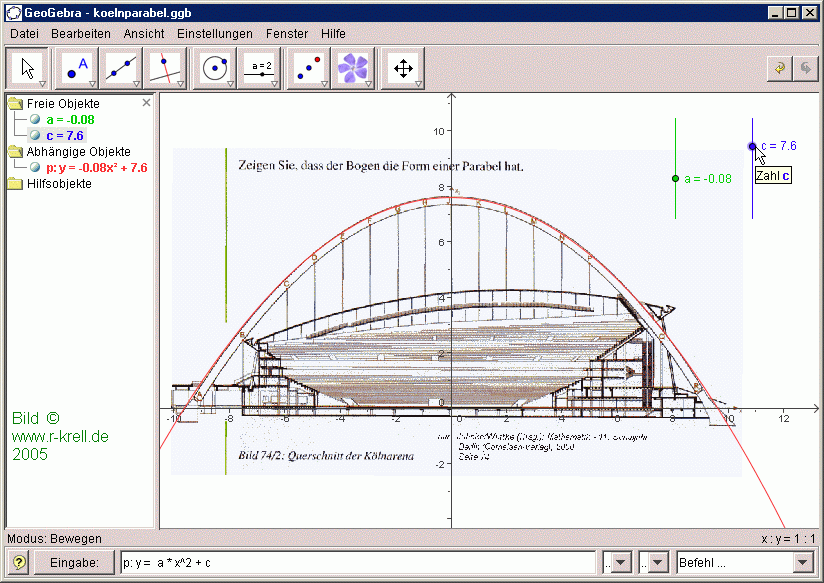 4. Parabeltest: Die eingescannte Bildvorlage einer Brücke oder hier des Bogens über der Kölnarena soll in das Programm übernommen werden. Durch Wahl geeigneter Zahlenwerte für die Parameter a und c soll dann eine (y-achsensymmetrische) Parabel p: y = a x2 + c so über das Bild gelegt werden, dass ihr Graph genau dem abgebildeten Bogen folgt. Zeichnen einer Parabel nach Vorschrift, einfache Variation der Parameter und das Einbinden eines Fotos sind hierzu erforderlich. |