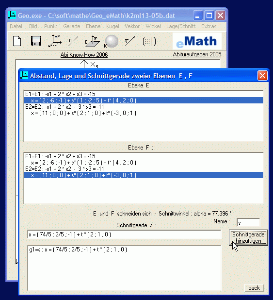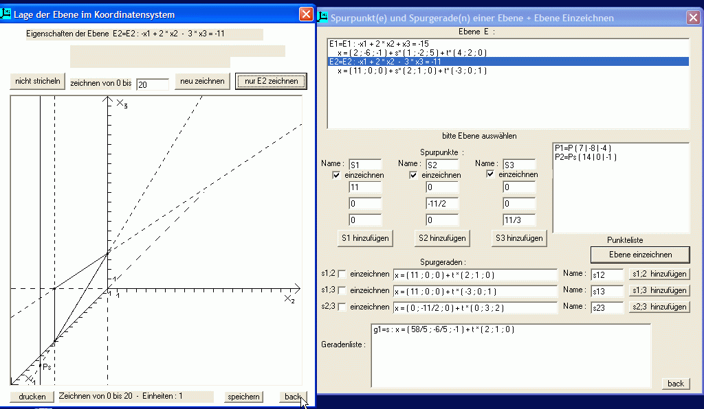 Bei der (automatischen) graphischen Darstellung ist das Koordinatensystem verschieb- und drehbar; weitere Hilfslinien wie etwa die Spurgeraden von Ebenen lassen sich mit rechtem Mausklick (und entsprechende Wahl im Kontextmenü) zusätzlich einblenden. So kann ein etwas besserer Eindruck der räumlichen Lage von Objekten vermittelt werden. Hervorzuheben ist, dass alle Objekte nachträglich per Mausklick verändert werden können, um z.B. für eine „schöne" Schnittgerade oder eine bestimmte Lage im Raum zu sorgen: Nach Klick auf jede ursprünglich eingegebene Zahl im rechten, weißen Ergebnisfenster kann diese mit linkem oder rechtem Mausklick in Einerschritten erhöht bzw. erniedrigt werden: Die graphische Darstellung und alle Ergebnisse passen sich sofort automatisch an! (Das ursprüngliche Eingabefenster, unten im Bild zur Information nochmal einmontiert, verschwindet dabei). Diese Fähigkeit erleichtert Lehrerinnen und Lehrern die Konstruktion von Aufgaben und ermöglicht Schülerinnen und Schülern, den Einfluss jeder Zahl in einer Gleichung auf das Objekt bzw. seine Lage zu studieren.