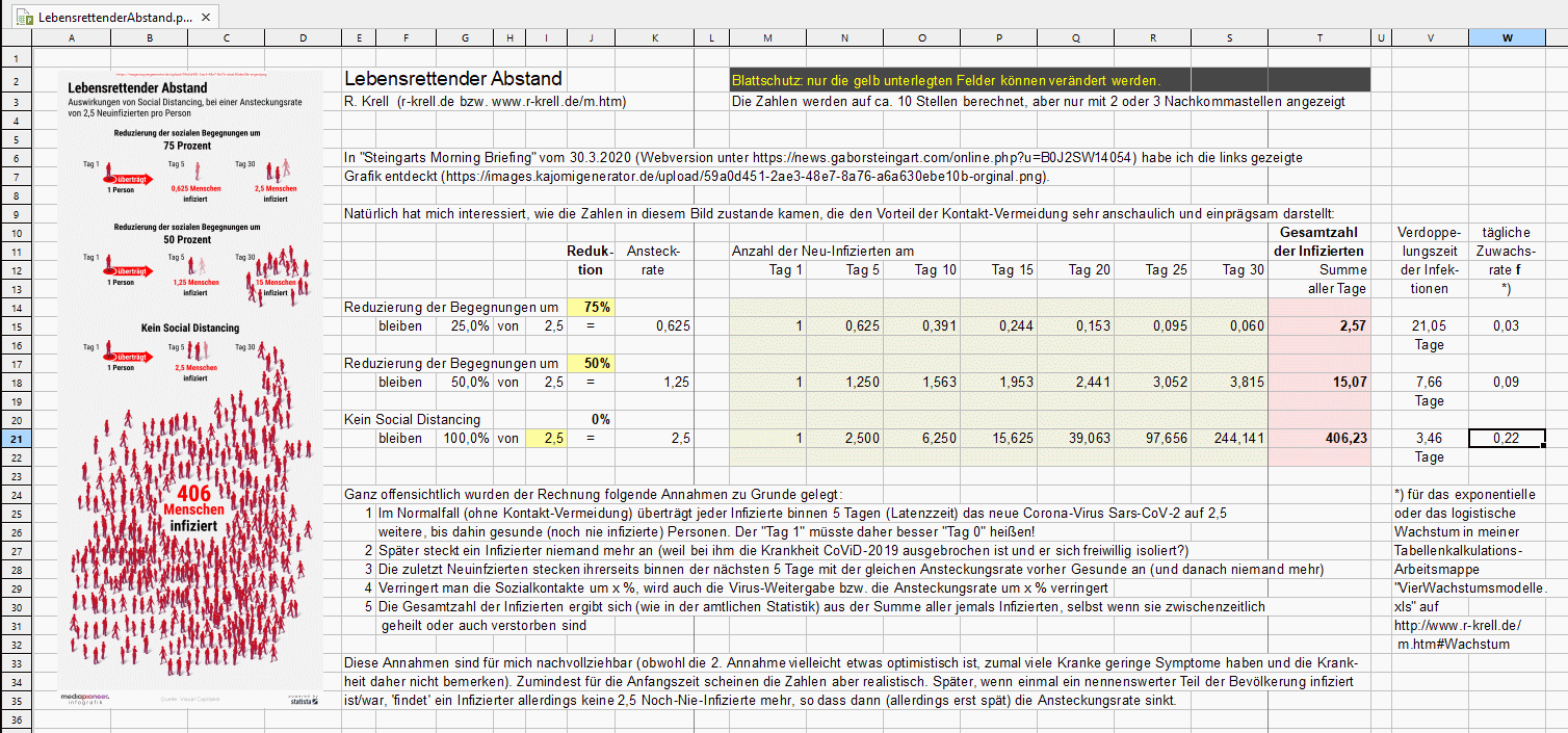 Viele Leserinnen und Leser fühlen sich zu Recht an die alte "Reiskörner-auf Schachbrett"-Aufgabe oder eine Schulbuchaufgabe zur Seerosen-Ausbreitung erinnert. Deshalb waren wirksame Maßnahmen geboten. Eine Impfung gab es noch nicht und Masken warn nicht ausreichend verfügbar. Es gelang durch Schulschließung und Kontaktverbot, verordnete Mindestabstände u.ä. die Verdoppelungszeit in Deutschland von anfangs nur 2,8 Tagen auf 3,4 Tage zu verlängern (Stand 24.3.2020). Und Ende März/Anfang April 2020 betrug die Verdoppelungszeit sogar schon über 5 Tage!