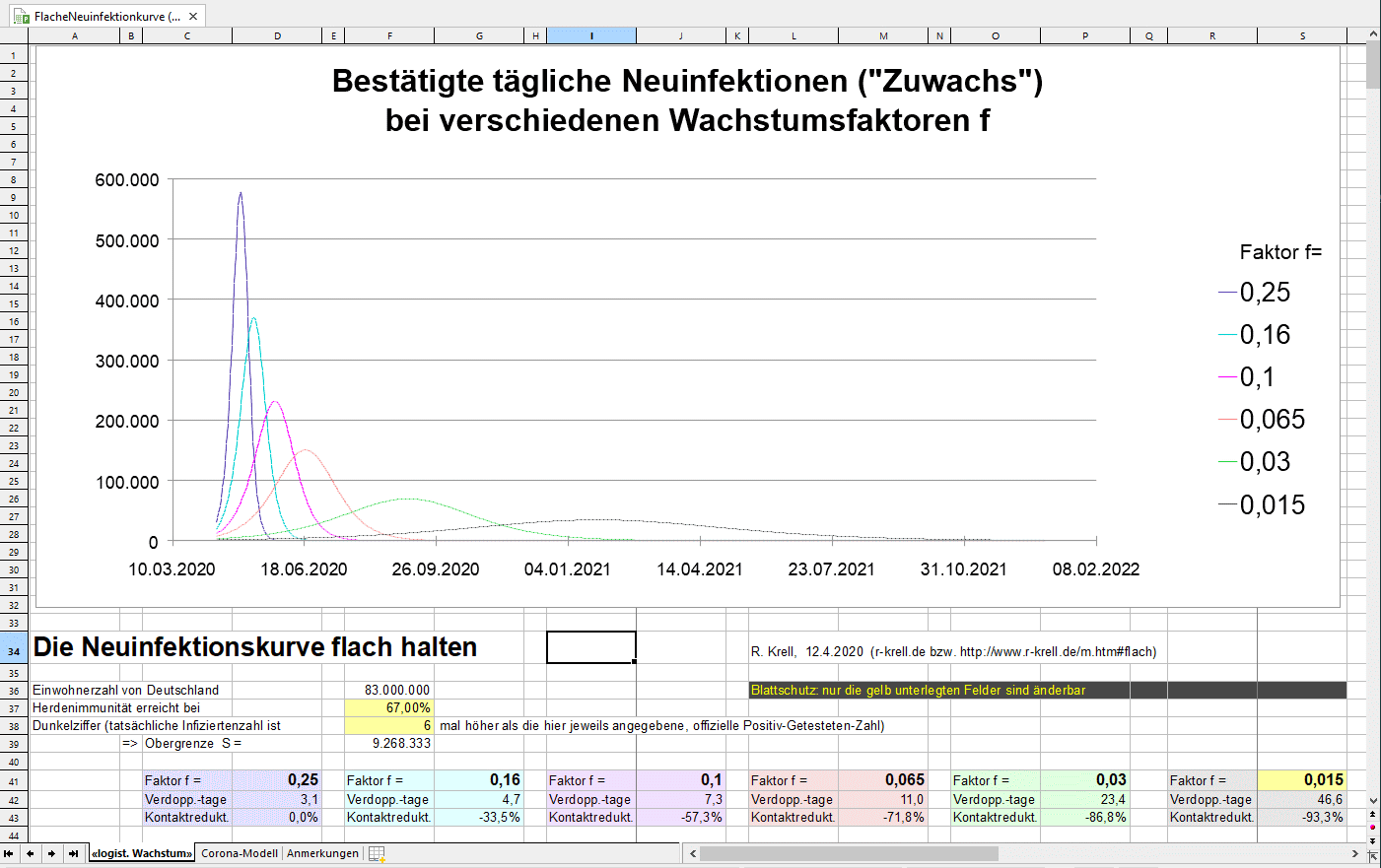 Nicht nur in der Corona-Krise sind mathematische Modelle gefragt, die die Ausbreitung von Krankheitserregern zutreffend beschreiben und vorhersagen können, damit man nötige Maßnahmen ergreift und sich auf Kommendes einigermaßen vorbereiten kann. Ich biete dafür ein Tabellenblatt an (im alten Excel-Format, das auch von neuen Tabellenkalkulations-Programmen verschiedenster Hersteller geöffnet werden kann). Die hellgrüne Kurve der täglichen Zuwächse ist die in letzter Zeit so oft gezeigte: entweder hoch und spitz oder etwas nach rechts verschoben, breiter und niedriger - hier zwischen dem 60. und 80. Tag: