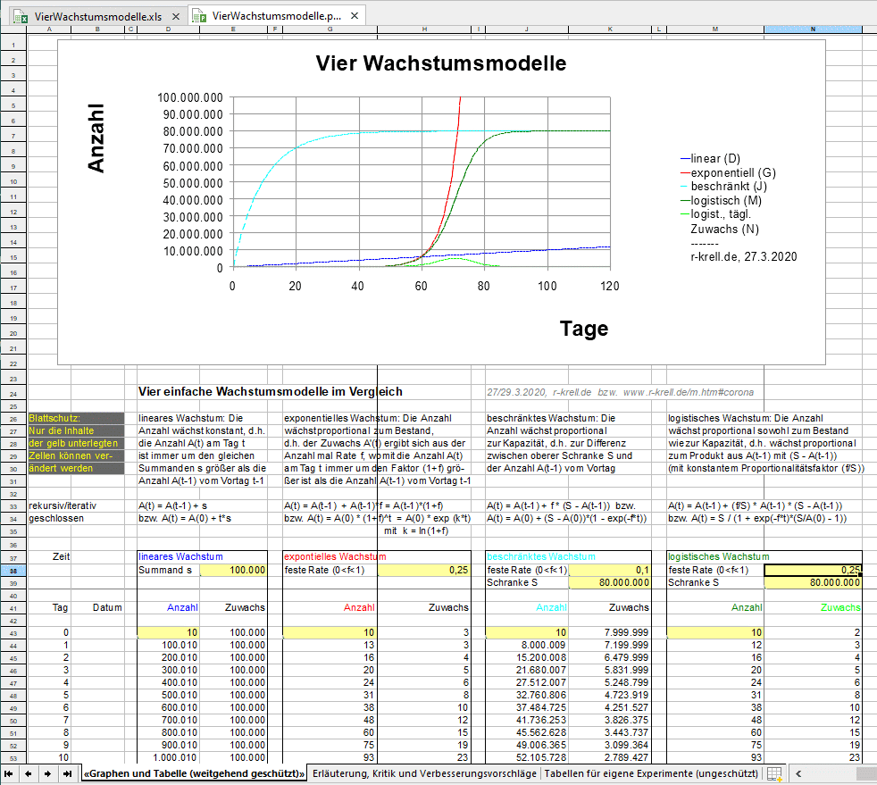 Durchgespielt sind vier grundlegende Wachstumstypen, wobei das logistische Wachstum die Krankheitsausbreitung am besten beschreibt. Auf einem eigenen Blatt in der Datei (zweiter Reiter der Arbeitsmappe) sind Erklärungen, Beispiele, die Beschränkungen der Modelle sowie Verbesserungsvorschläge genannt. Im dritten Blatt sind die vorgestellten Tabellen für Ihre eigenen Experimente und Ergänzungen frei gegeben. Achtung: obwohl die Ausbreitungsrate in den letzten Tagen weiter gefallen ist und am 29.3.2020 offenbar 'nur noch' bei f = 0,16 liegt, habe ich die gezeigten Graphen noch mit f = 0,25 berechnet (s.o.). Die Parameter können aber von Ihnen verändert werden, wenn Sie die Datei (herunter laden, also speichern und) öffnen: