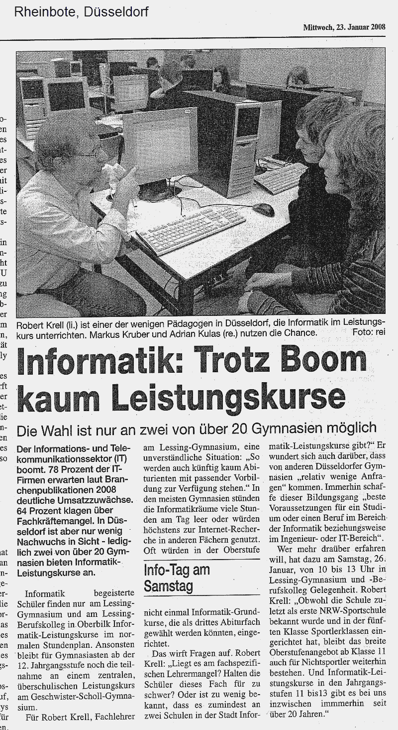 Gerade in unserer heutigen Zeit, wo der Wirtschaft laut Medienberichten zunehmend qualifizierte Mitarbeiterinnen und Mitarbeiter im IT-Bereich fehlen, sichert ein Informatik-Leistungskurs den entscheidenden Vorsprung -- natürlich vorausgesetzt, man interessiert, engagiert und eignet sich für das Fach und kann sich zumindest vorstellen, später vielleicht in dieser Richtung tätig zu werden. Wenn man bis zum Abitur merkt, dass man doch lieber einen anderen Beruf ergreifen will, kein Problem: Mit dem Abitur kann man auch jedes andere Fach -- von Medizin über Jura bis zur Sinologie -- studieren. Nebenstehender, inhaltlich weiterhin voll zutreffender Pressebericht macht deutlich, dass das "Lessing" mit dem Angebot des Informatik-Leistungskurses immer noch eine wichtige Sonderrolle einnimmt -- und das seit über 30 Jahren. Ein Klick aufs Bild öffnet den (bis auf den Standort des Zentralkurses inhaltlich immer noch aktuellen) Artikel groß in einem neuen Fenster. Statt des dort angegeben alten Informationstags finden Sie auf lgbk.de die aktuellen Termine oder hier weiter unten eine allgemeine Orientierung nach den Erfahrungen der letzten Jahre.