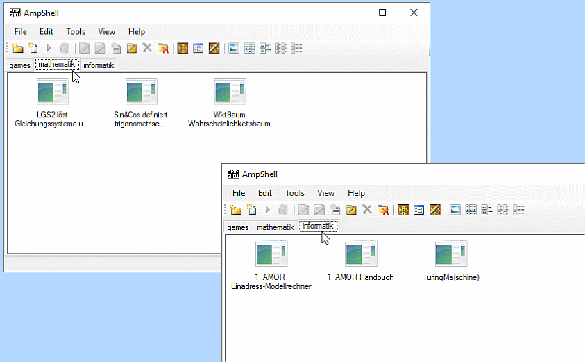 Aber nochmal: Wer meine Programme 1_AMOR, TuringMa, Sin&Cos, LGS_2 und WktBaum im Komplettpaket "DosProgs_mit_AmpShell.zip" herunterlädt, braucht sich um die vorgenannte Zusatzsoftware und deren Einrichtung nicht mehr zu kümmern: Er bekommt die im zweiten Punkt erwähnte DosBox und dazu die fertig eingerichtete Oberfläche AmpShell bereits gratis mitgeliefert - nach Doppelklick auf "!DosProgs mit AmpShell starten.bat" muss man nur noch zu einem der beiden Tabs (Reiter) 'mathematik' oder 'informatik' wechseln und das gewünschte Programm wählen!