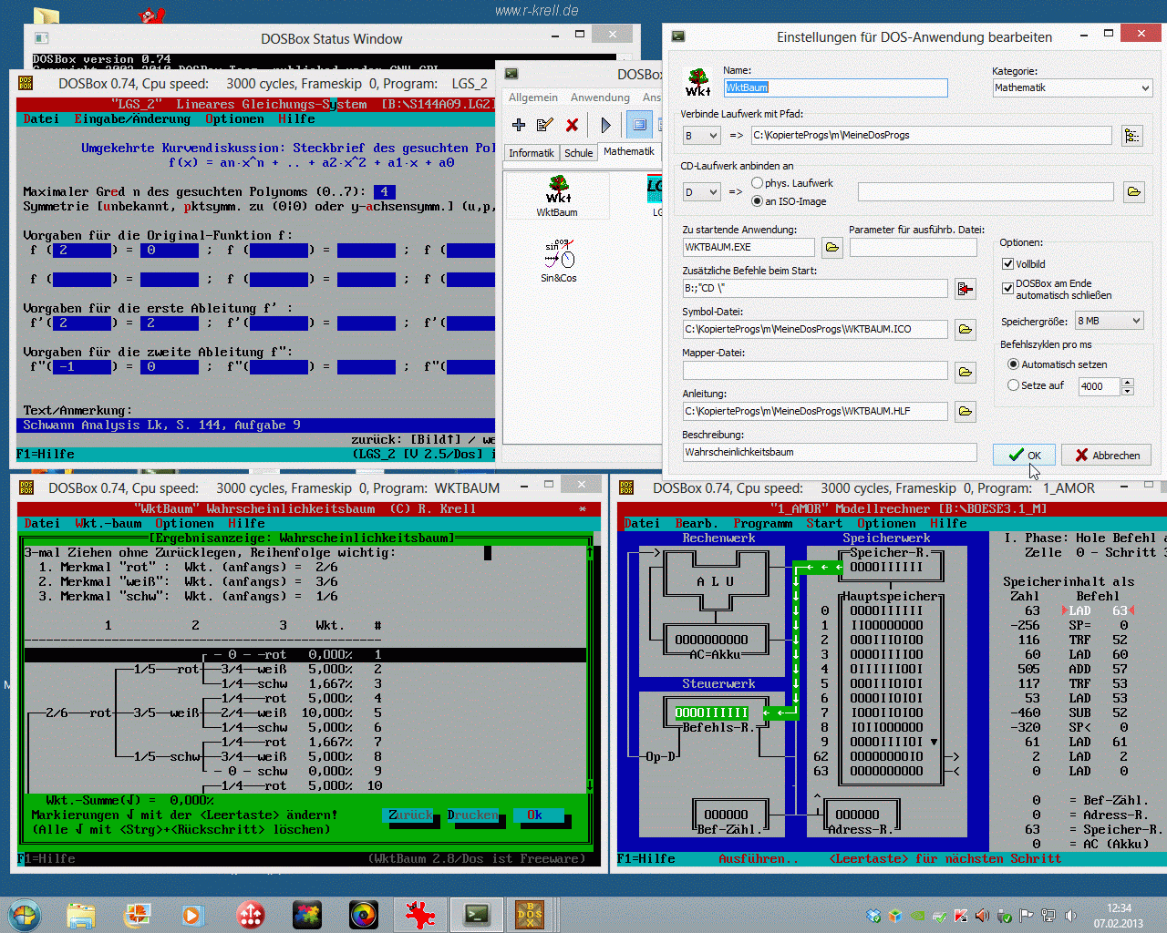 Unter Windows 8 bis 11 und neuer laufen die hier herunter ladbaren Programme nicht mehr ohne Weiteres. Deshalb habe ich 2017 meine fünf Programme 1_AMOR, TuringMa, Sin&Cos, LGS_2 und WktBaum zusammen mit AmpShell und der DosBox in eine Archiv-Datei zusammengepackt. Das erlaubt auch unter 64-Bit-Windows den leichten Start meiner Programme.