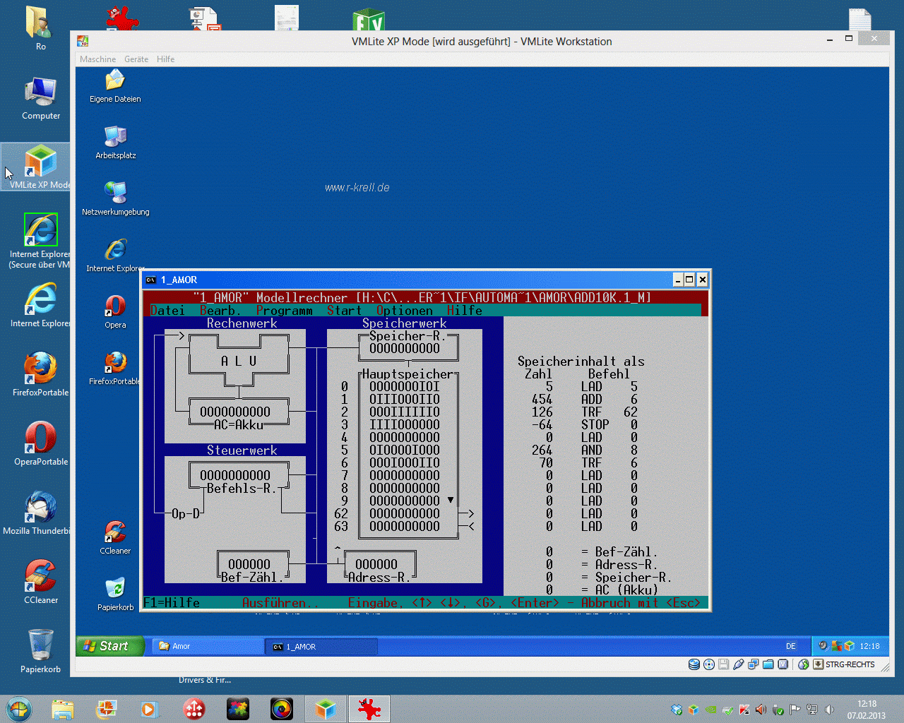 kontextsensitive Hilfe. Hinweis: In einer Examensarbeit aus dem Jahr 2000/2001 werden fünf Modellrechner verglichen: 1_AMOR erhält dort wegen seines pädagogischen Konzepts den Spitzenplatz - trotz der inzwischen antiquierten Dos-Oberfläche. (Der dort noch als Nachteil genannte Preis ist inzwischen gegenstandlos, seit 1_AMOR als Freeware kostenlos ist.) Die vollständige Untersuchung „Modellrechner im Informatikunterricht der Sekundarstufe II und ihre didaktische Gestaltung" gibt's als ca. 2,4 MB große pdf-Datei auf http://www.muenster.de/~cremer/mitJava/javaLernen/Examen2/Modellrechner.pdf (im Jan 2025 nicht mehr erreichbar) |